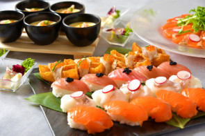 牛肉のステーキ/黒毛和牛バーガー/寿司~飾りいなり寿司、鮪、トラウトサーモン~