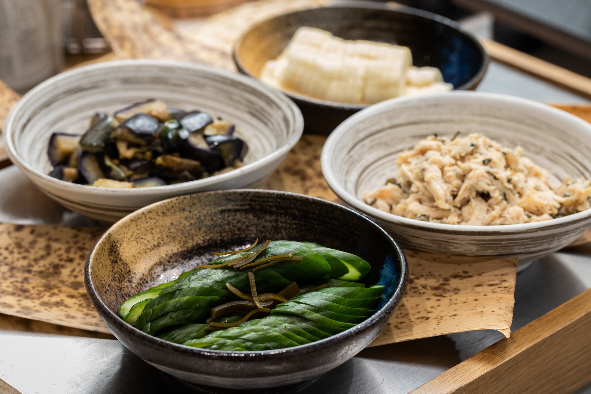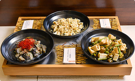 すぐき×鶏胸肉、実山椒×茄子煮びたし、古漬け胡瓜×蓮根